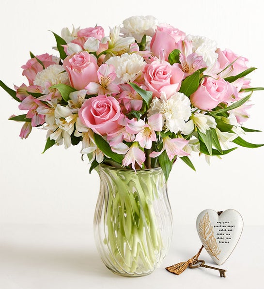 Express your heartfelt sentiments to friends and family with our beautiful condolence bouquet. Available in two sizes, sweet pink & white roses, lilies and more are hand-gathered with fresh greenery. It’s a beautiful gift for when words alone don’t seem quite enough.